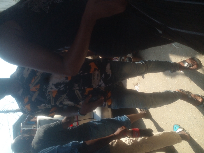 A daylight scene in Satellite Town, Nigeria, depicts multiple individuals on a paved outdoor surface