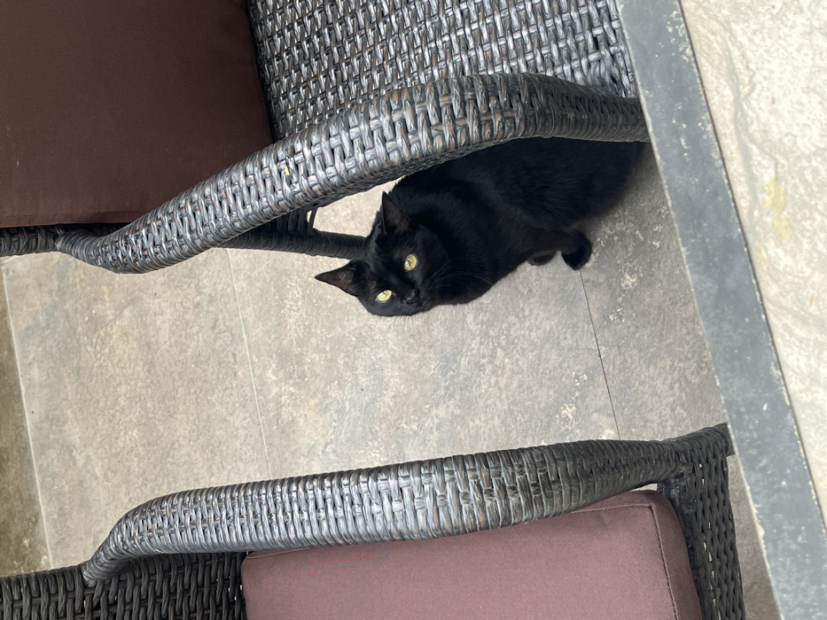 - "A black cat with solid black fur and luminous yellow-green eyes is depicted seated on a light grey tiled surface, positioned between two dark grey synthetic wicker patio chairs" by FM-leUqa2, licensed under CC BY 4.0