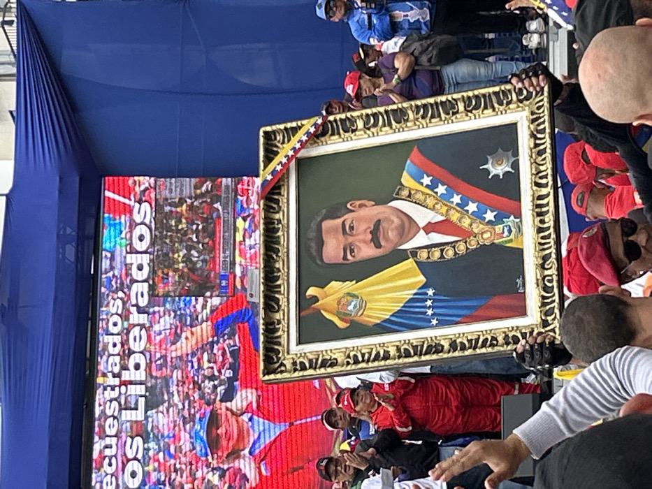 A portrait of Nicolás Maduro in a gold ornate frame is held amidst a crowd. The painting depicts Maduro in a military uniform with the Venezuelan flag. A Venezuelan flag banner drapes the frame. In the background, a large LED screen displays a crowd scene and the words "Secuestrados, Los Liberados." Blue fabric drapes behind the screen. People in red caps and casual wear are visible in the surrounding crowd.