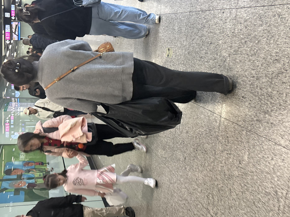 The image depicts a crowded indoor metro station platform or concourse in Yuexiu District, Guangzhou, China. The environment is brightly lit with a light grey speckled tiled floor. In the immediate foreground, facing away from the camera, a woman with dark hair secured with a dark hair clip wears a grey turtleneck sweater, black trousers, and dark flat shoes. She carries a brown leather crossbody bag over her right shoulder and a large black plastic bag in her left hand. To her left, an adult woman with dark hair walks alongside a young girl. The adult woman wears a pink padded jacket over a red top, black trousers, and silver athletic shoes. She carries a black backpack and a pink garment draped over her left arm, with an orange pom-pom charm attached to her bag strap. She holds the left hand of the young girl. The girl, approximately 5-8 years old, wears a pink long-sleeved top with a white graphic, a pink and white patterned skirt, white tights, and white athletic shoes. She holds a white paper bag in her left hand. Further into the background, several individuals are visible. To the right, a person is seen from the waist down, wearing light blue wide-leg trousers and white sneakers. To the left, a man in a light-colored jacket and a red baseball cap walks. Centrally, another man in a dark jacket is engrossed with a mobile phone. Green illuminated directional signs are mounted on the wall in the background, displaying white text in Chinese and English, including "文德路" (Wende Road), "教育路" (Jiaoyu Road), and various "EXIT" indicators with directional arrows (e.g., "EXIT B", "EXIT D", "EXIT A", "EXIT C"). The overall scene conveys typical pedestrian movement within a public transportation hub.