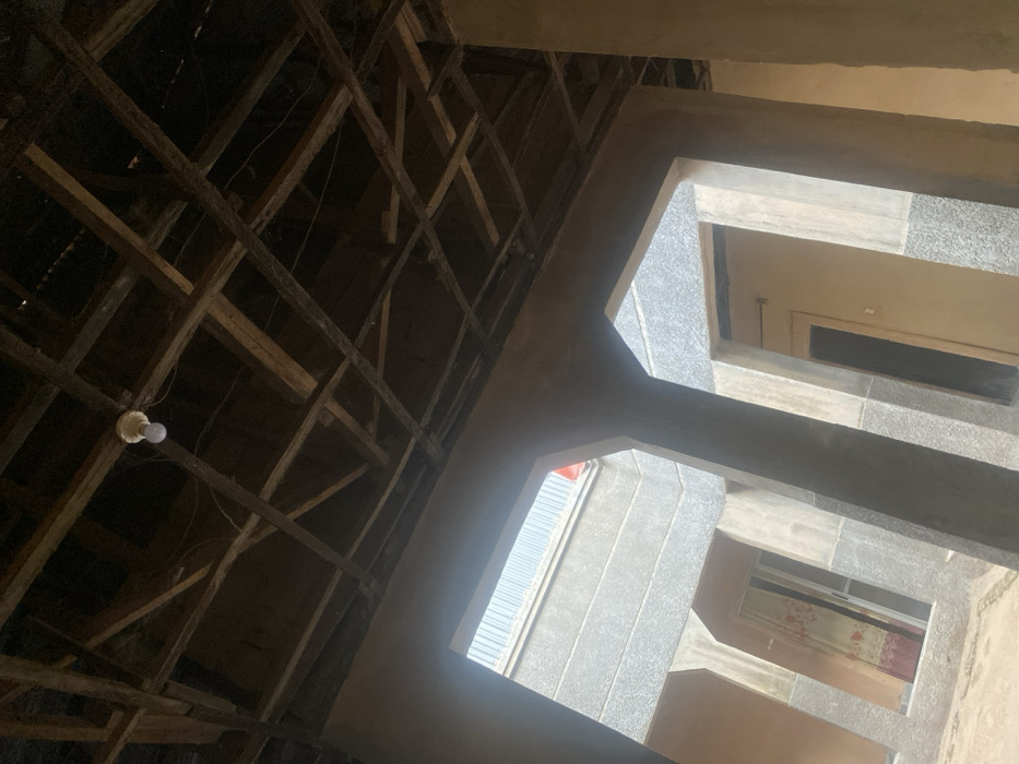 A distorted upward view shows both unfinished roof rafters and a concrete structure. The rafters form a dark, diagonal grid with a single exposed bulb hanging. In contrast, the concrete structure reveals a multi-story building façade. It is viewed through the concrete framework, showing windows and a door, catching external light. The composition creates a juxtaposition of the old and raw versus the modern and constructed.
