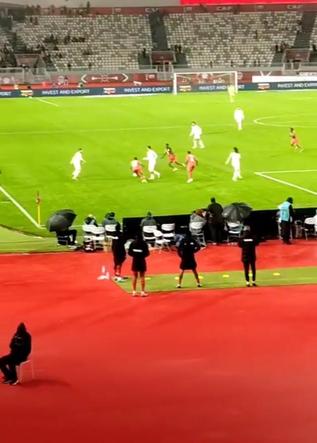 soccer match in progress from a spectator's point of view. Players wearing white and red uniforms are actively playing on the green field. Near the edge of the field, a small group of people wearing black stand, some holding umbrellas. A person sits on a chair apart from the group. The stands are partially filled with spectators, and signs displaying the words "INVEST AND EXPORT" are visible along the upper edge of the field. The environment appears to be a large stadium with good lighting.