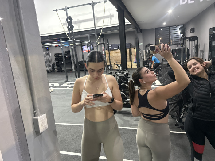 Three women are in a gym, posing in front of a mirror. The woman on the left is wearing a white sports bra and neutral leggings, looking at her phone. The woman in the middle takes a selfie, wearing a black sports bra and matching leggings. A third woman stands to the right, clad in a black puffy jacket, black pants, and red detail. Gym equipment is visible in the background.