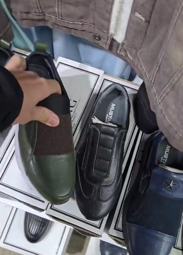 A person holds a green slip-on shoe with a white sole and brown elastic band over a shelf of similar shoes in boxes. The shoe is held up to show the top, bottom, and inside. The shoes are on display for sale and are made by Mustang. The person is wearing a black shirt and holding a black bag. A brown denim jacket and red shirt are visible in the background. The setting appears to be a market or retail environment.