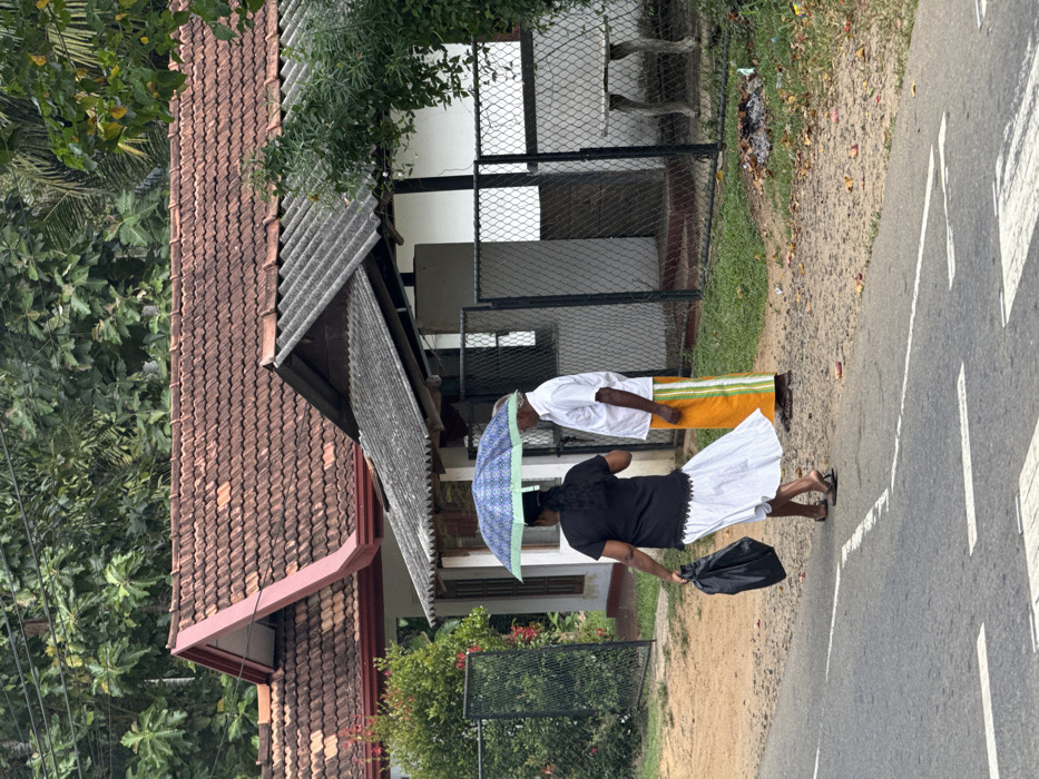 Two individuals walk on a street; one wears a white shirt and a patterned orange and yellow wrap, while the other sports a black top and white skirt. The second person holds a black bag and an umbrella. They pass by a building with a reddish-brown tiled roof and a gray roof extension. A chain-link fence surrounds the building's perimeter, and trees and shrubs are visible in the background.