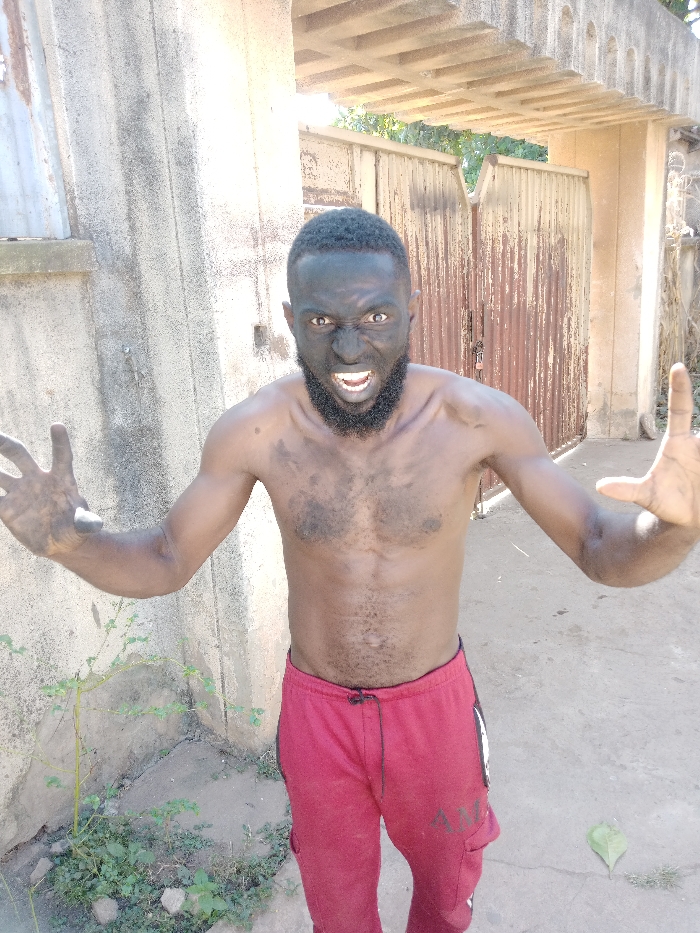 This image, captured in Sabon Tasha, Nigeria, shows one adult male standing shirtless outdoors. A dark substance covers his face, neck, and hands. He has short dark hair and a beard. His facial expression is aggressive, with wide eyes and an open mouth revealing teeth in what appears to be a snarl or yell. His arms are extended outward, slightly bent at the elbows, with fingers splayed. He is wearing red sweatpants. The background consists of a light-colored concrete wall on the left and a set of heavily rusted, corrugated double metal gates in the center, situated beneath a concrete archway featuring rectangular cutouts. Sparse green vegetation is visible at the base of the left wall and behind the gates. The ground is bare earth. The scene is illuminated by bright daylight.