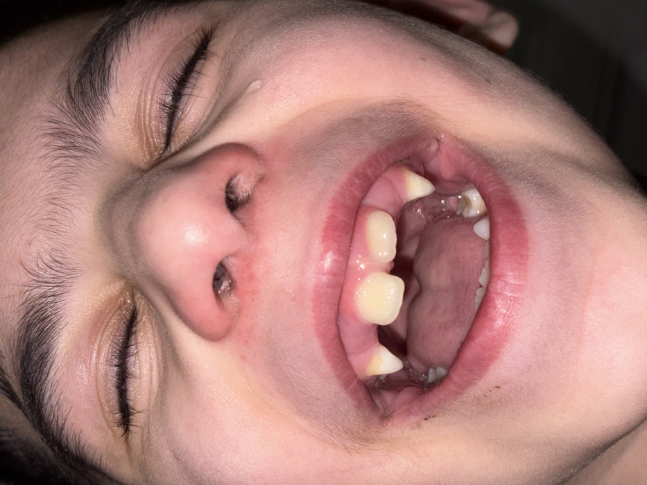 A close-up, frontal image depicts the face of a young individual. Both eyes are tightly closed. The nose exhibits visible reddening around the nostrils. A single tear is present on the right cheek, originating near the outer corner of the right eye. The mouth is open widely, revealing an incomplete dentition in the upper arch, characterized by two prominent, pointed, conical teeth resembling canines, and two central incisors. The lower dental arch contains a clear, U-shaped oral appliance, with several natural teeth visible posterior to it. The background is dark and undifferentiated. The scene is located in Saint-Étienne, France.