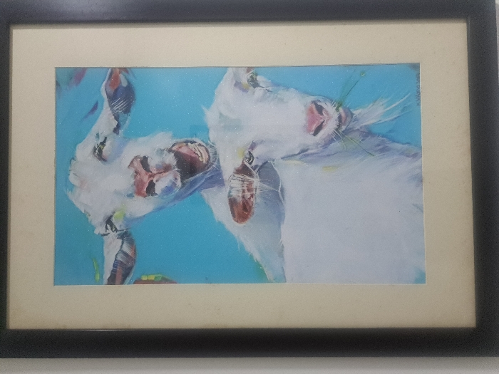 This image is a photograph of a framed artwork, observed indoors in Moba, Nigeria. The artwork itself is a vertically oriented painting or print depicting two white goats against a vibrant blue background with a subtle, speckled texture. The upper goat is positioned centrally, facing forward with its mouth wide open, revealing teeth and tongue, and its ears splayed. Its fur is primarily white, accented with pink tones on its snout and blue-grey shading. The lower goat is partially visible below the upper goat, also facing forward, with its mouth closed and several strands of green vegetation protruding, indicative of eating. This goat has a short white goatee. The artwork is enclosed within a dark, rectangular frame and an off-white mat board. A partial signature, appearing to be "K. YILMAZ", is visible in the bottom right corner of the artwork. The framed piece is mounted on a plain, light-colored wall.