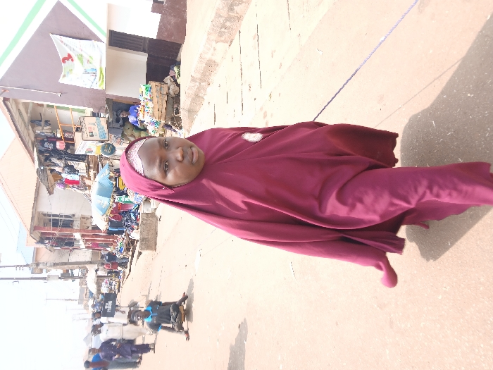 This image depicts an outdoor market street scene in Heany, Zimbabwe, under bright daylight conditions. In the foreground, a young person, possibly female, with light skin and dark hair, is walking towards the viewer, slightly angled to the left. She wears a dark red/burgundy hijab with a lighter patterned edge around the forehead and a matching long dress/abaya, which features a small, white, circular embellishment on the left chest area. Her gaze is directed straight ahead. In the midground, to the left of the main subject, a young male individual is seated on a low, wooden, wheeled platform, propelling himself forward with his hands. He wears a dark blue short-sleeved shirt and dark trousers. Behind him, a procession of approximately five adult males is walking in a line, moving away from the camera. The lead male in this group carries a white rectangular sign that appears to read "WE ARE PRAYING". Most individuals in this group wear light-colored traditional garments. The right side of the midground and background features a series of multi-story buildings housing various shops and stalls. Numerous articles of clothing are displayed hanging outside these establishments. A light blue market umbrella shades a vendor's stall, which contains various goods. Another stall displays items, possibly produce, in wooden crates. Several other individuals are visible walking or standing near these shops. Overhead utility poles and wires are present against a clear, light-colored sky. A distinct, rough concrete barrier or curb runs along the right side of the street. The ground is an unpaved or dirt street, appearing somewhat dusty. A blue rope or cord lies across the lower right corner of the foreground, running along the ground. Shadows are cast by the strong sunlight.