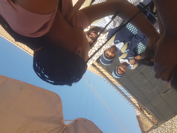 The image depicts an outdoor scene under a clear blue sky, consistent with daylight hours in Jos, Nigeria. In the immediate foreground, the top of a person's head with dark braided hair, a shoulder clad in a pink top, and clasped hands are visible, indicating the perspective of the photographer. Behind this individual, three other people, appearing to be school-aged children or teenagers, are present. Two individuals on the left are uniformly dressed in dark blue long-sleeved tops featuring a light-colored geometric pattern across the chest, white collared shirts, and matching dark blue knitted beanies with a similar pattern. Both carry light-colored backpacks and gaze directly towards the camera with neutral expressions. The third individual, positioned to the right and partially obscured by the foreground, wears a white and dark blue checkered uniform shirt and smiles towards the camera. The background features a dark metal gate topped with a security fence, possibly featuring barbed wire or spikes. Behind the gate, a light-colored, possibly unpainted or textured, building wall is discernible. Electrical wires cross the upper portion of the frame against the bright blue sky. A portion of a light-colored awning or umbrella structure is visible in the upper left corner. The scene is brightly illuminated by direct sunlight.