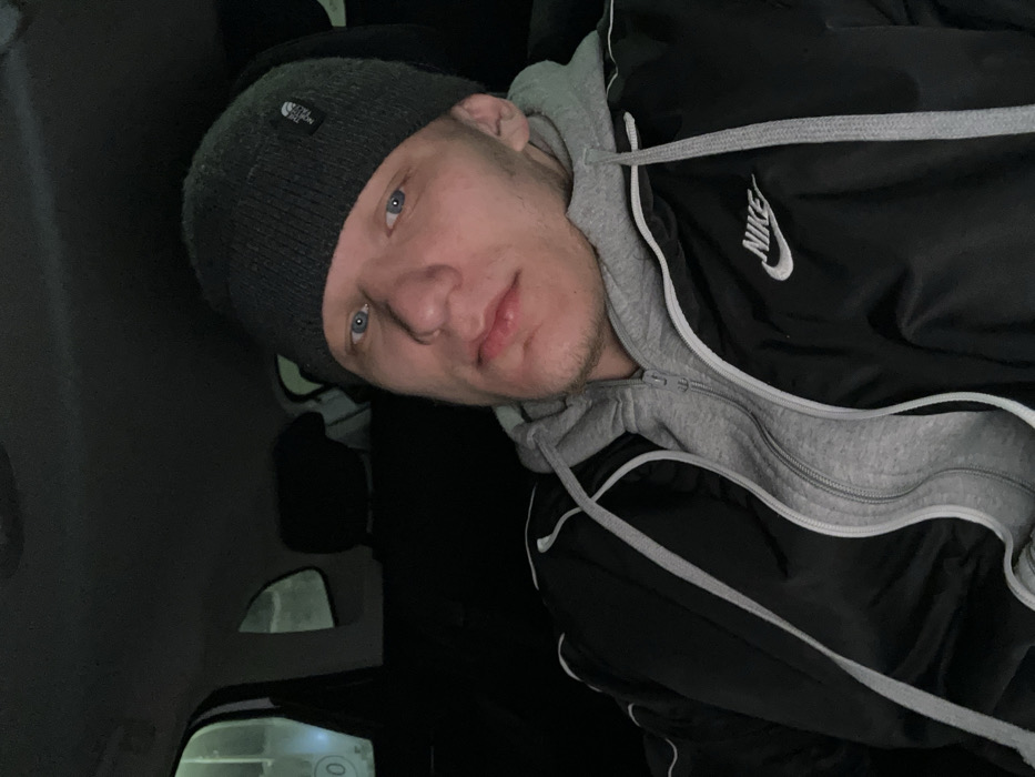 A male individual is depicted in a close-up, head-and-torso shot, seated inside a vehicle in Dobryanka, Russia. The man has light skin, blue eyes, and visible stubble on his jawline and chin. He wears a dark gray knitted beanie, a light gray zippered hoodie, and a black jacket with white piping and a white Nike logo on the right chest. He is looking directly at the camera with a neutral expression. The vehicle interior is dark, with elements of the ceiling and seat headrests visible in the background. Through the left-side windows, faint ambient light illuminates indistinct exterior structures, including a white surface with a circular or "0" marking. The scene appears to be documented at night or in low-light conditions.