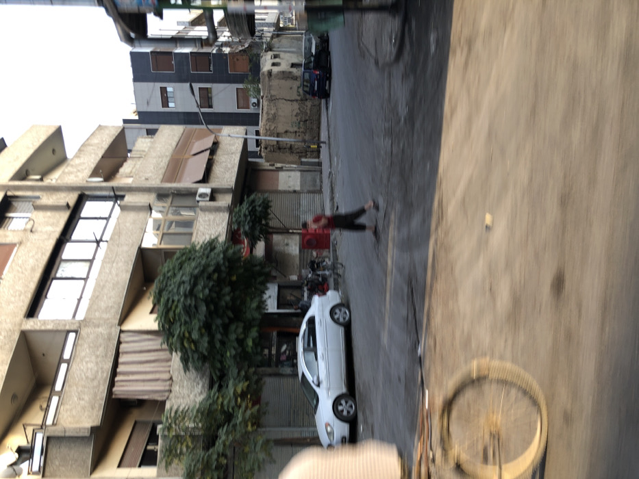 A street scene with buildings on one side. A white car is parked near a lush green tree. A person walks across the street, their form slightly blurred due to motion. Several motorcycles are parked nearby. The street is paved, and a bicycle wheel leans against a wall. The image appears to be taken at street level, capturing everyday urban life.