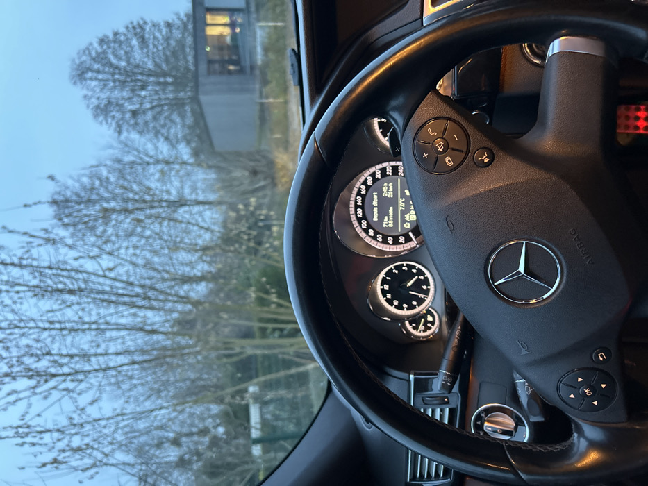 - "The image depicts the interior of a Mercedes-Benz vehicle, specifically from the driver's perspective, looking out through the windshield into a semi-rural or suburban environment at dusk or dawn" by FM-jaRbj2, licensed under CC BY 4.0