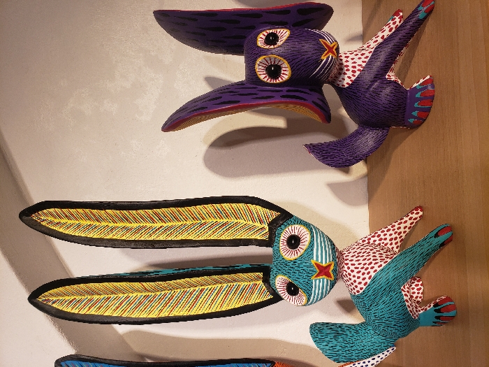 Three handcrafted wooden alebrijes adorn a wall