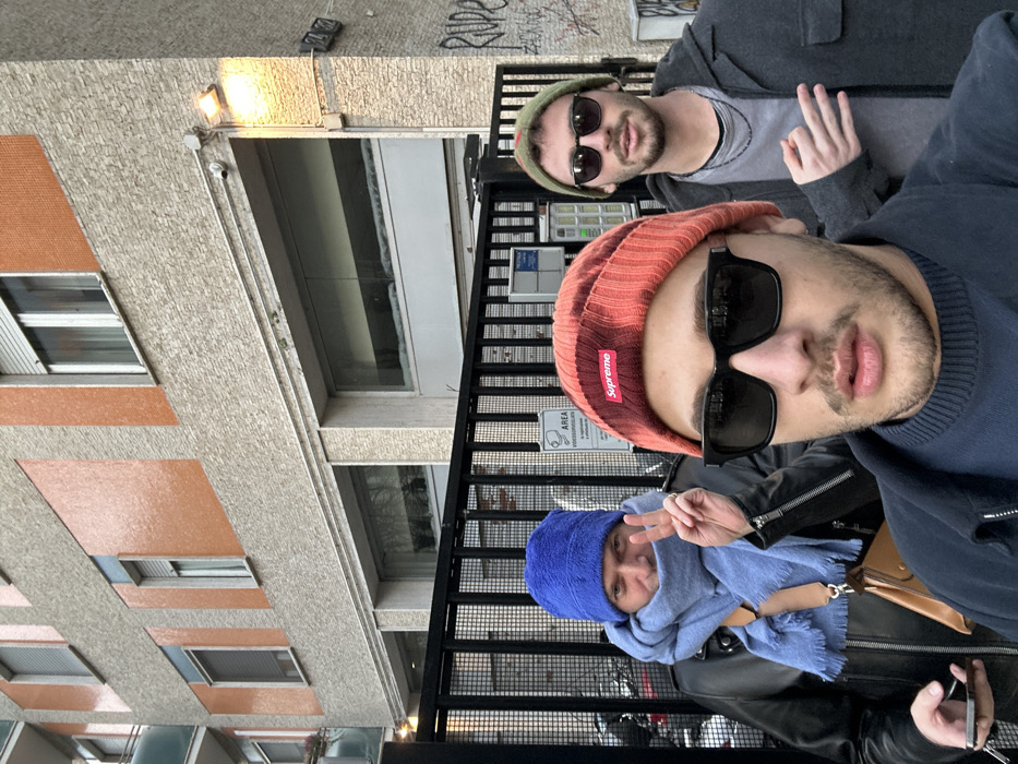 A vertical-format, daylight selfie-style photograph captures three adult males in front of a multi-story building