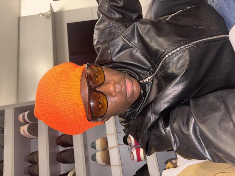 A person wearing an orange beanie and oversized sunglasses is lying down. They are wearing a black leather jacket. A shelf filled with shoes is behind them on the left side. A light gray cabinet and dark screen are visible in the background. The person's face is centered in the frame.