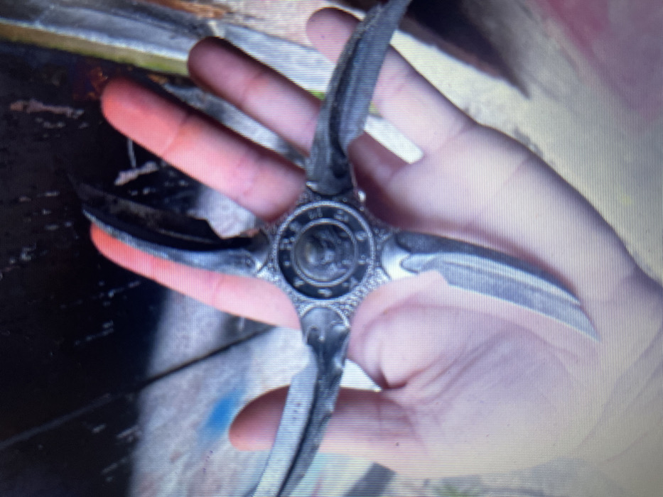 The image displays a human hand holding a multi-bladed metallic object