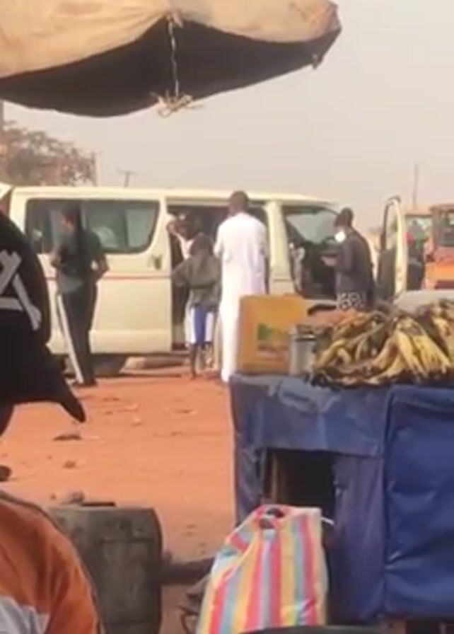The video depicts a bustling outdoor market scene. A white van with the word "LINKS" on its side stands with its doors open. Several people surround the van, some entering or exiting, and others standing nearby. One person is wearing a white outfit. Another is wearing a face mask. The market is characterized by a red dirt ground and a variety of stalls and vendors. In the foreground, there is a table with bananas on it, covered by a blue tarp under a large white umbrella. Other objects scattered around include a black basin, a striped bag, and a black barrel. In the background, heavy machinery can be seen. The atmosphere appears busy and active.