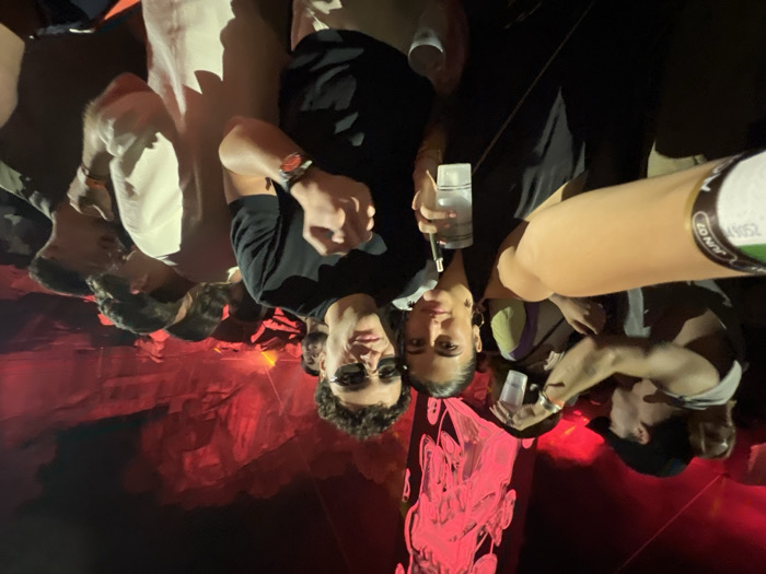 group of people at a crowded event. Two people are in the foreground, a man and a woman, who are taking a selfie. The woman is wearing a black tank top and the man is wearing a black t-shirt. They are both holding a drink. The image was likely taken in Braga, Portugal. The background is a dark, crowded scene with red lights and people. The environment is likely an event or festival. The man is wearing sunglasses and has dark hair, while the woman has long, dark hair and is smiling. There is a red light in the background which casts a shadow on the people and objects. There is a red backdrop with a vague image in the background, a possible mural or projection. The woman is holding a can of beer with the word "LOJA" on it. There is a third person, partially visible in the picture, whose arm is reaching in from the left side of the picture. The scene is a party or a social event.