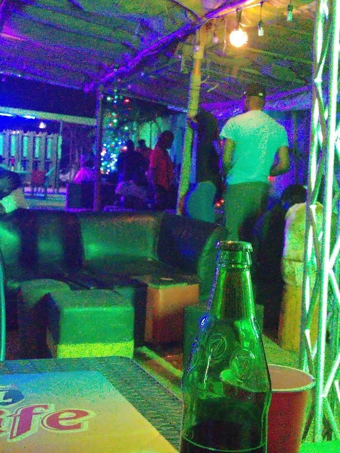 Inside a brightly lit bar, patrons mingle in the background near a Christmas tree