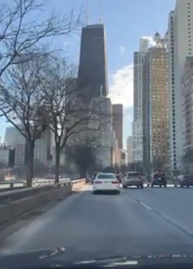 view from inside a car driving on a city street, likely a highway. The road is wet. The car is in motion, following a white sedan and other cars. On the right side of the road, there is a pedestrian walkway separated by a low concrete barrier. The left side of the road has bare trees lining the divider. In the background, there is a clear view of the Chicago skyline. Prominently featured is the 875 North Michigan Avenue building, formerly the John Hancock Center, along with several other tall buildings. The sky is blue with scattered clouds.