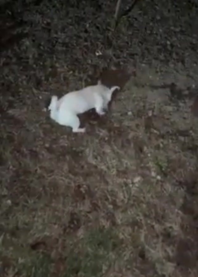 A short video shows a small, mostly-white dog in a yard or other grassy area. The dog is digging in an area of exposed dirt, pushing its head into a hole. The ground is covered with dried grass and leaves. The video is shot at night.