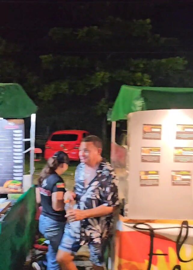 At night, a bustling outdoor food market is illuminated by artificial lights. A food stand, marked by the sign "GAUCHO", has staff preparing food and serving customers. Another stand specializes in "ACARAJÉ", a Brazilian street food. People wander along the paved area between the stalls, stopping to socialize and grab a bite. A lush tree line forms a dark backdrop, contrasting with the lively atmosphere of the market.