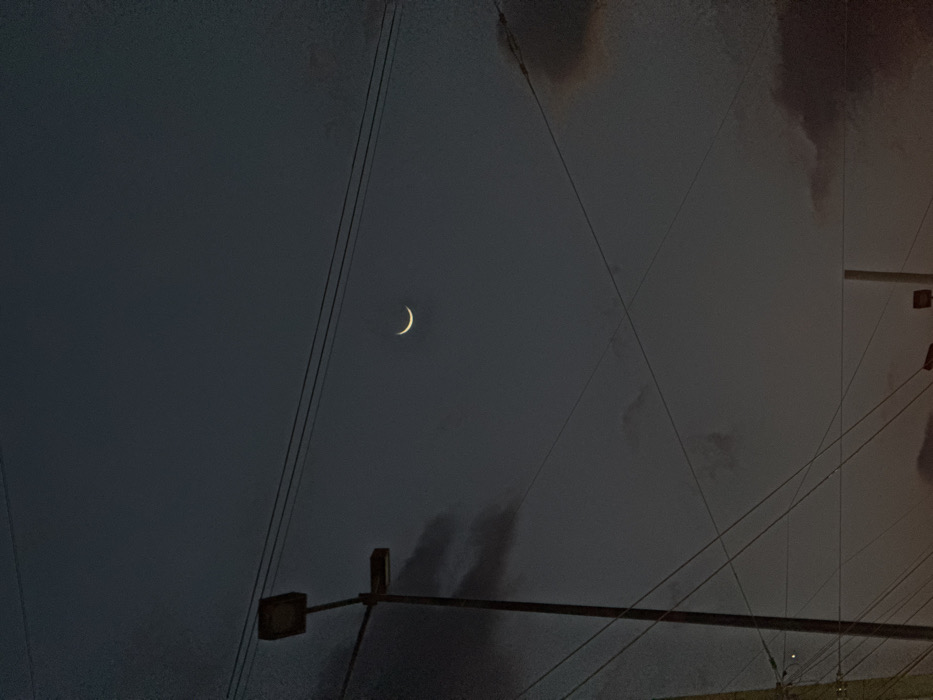 The image captures a twilight sky scene over Puebla, Mexico. A bright, slender crescent moon is visible in the upper right quadrant against a dark, deep blue-grey sky punctuated by scattered, diffuse clouds. In the left foreground, a dark, industrial-style streetlamp pole with a rectangular light fixture extends vertically. Multiple dark utility cables crisscross the upper and mid-sections of the frame horizontally and diagonally. Remnants of additional structures are faintly visible at the bottom right. The scene is devoid of human presence or active interactions.