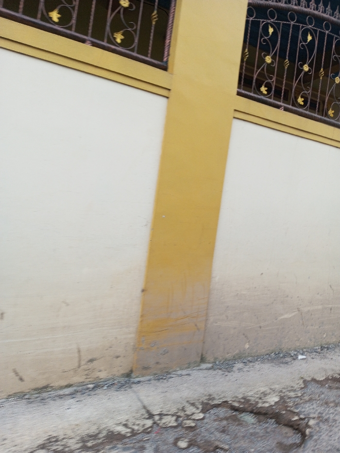The scene depicts an exterior wall of a building in Vieng Phouka, Laos. The wall is painted in a light, off-white or pale beige color, and is vertically bisected by a prominent yellow-gold painted pillar. Above the primary wall section, at the top of the frame, are two window openings, each protected by a dark, wrought-iron style metal grille featuring intricate scrollwork and golden floral accents. The lower portion of the light-colored wall, and the base of the yellow-gold pillar, exhibit visible streaks of dirt, grime, and dark staining, consistent with environmental exposure. The ground level in the foreground is a textured concrete or paved surface, showing multiple cracks, fissures, and patches of exposed soil or loose gravel. No individuals, actions, or interactions are present in the image.