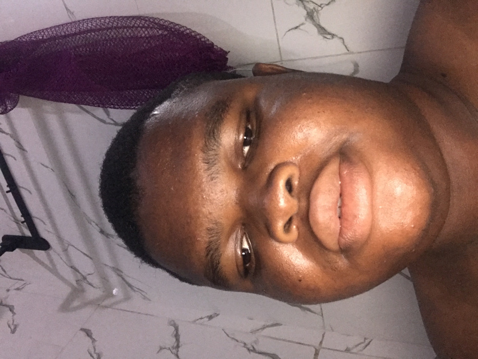 A person with dark skin and short black hair lies against a background of marble tile. A dark purple mesh bath sponge is above their head. The person has a round face and full lips. Their eyes are open, and their gaze is directed toward the viewer. The image is well-lit, revealing a slight sheen on the person's skin. Part of their shoulder and upper chest are visible on the right side of the frame.