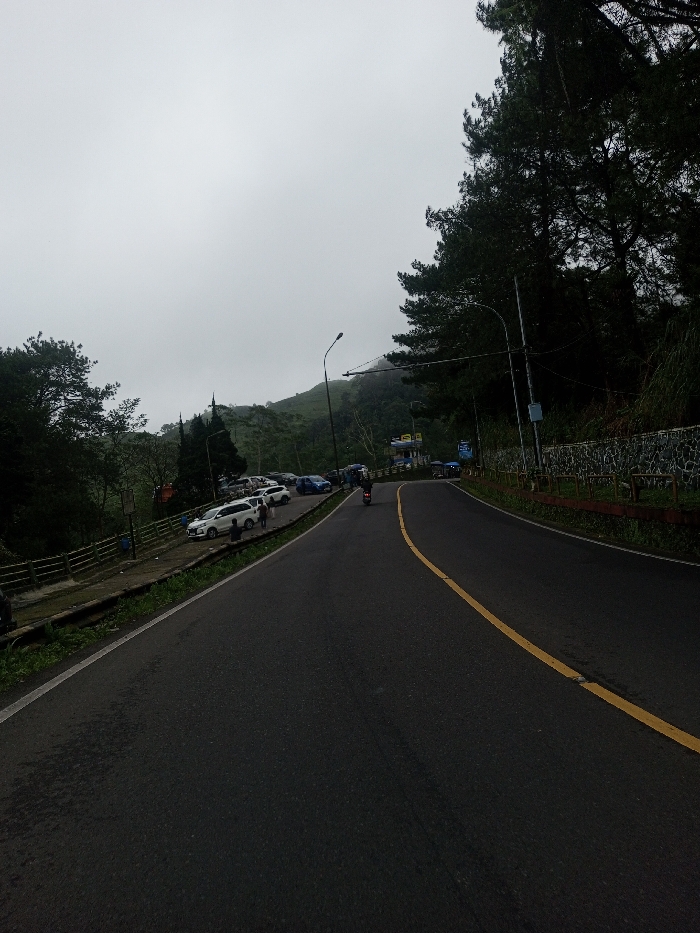 The image depicts an overcast day on a winding asphalt road in what is identified as the city of Sandamal Eliya, Sri Lanka. The road, dark grey with a continuous yellow center line, curves slightly to the right as it recedes from the viewer. A single white line marks the road's edge on the left. On the left side of the road, an elevated, paved parking area is present. This area contains approximately ten to fifteen parked vehicles, predominantly sedans and SUVs, including at least one white SUV prominent in the foreground. Several individuals are visible near the parked vehicles, standing or walking, but no specific interactions are clearly discernible. A beige-colored railing borders the parking area, beyond which dense green foliage and trees, including tall, slender conifers, extend down a slope. A building with an orange roof is partially visible behind the parked cars. The right side of the road is lined with dark green conifer trees. A stone wall, possibly dry-stacked, runs along the roadside behind a low railing with dark posts and light-colored horizontal bars. Two black street light poles with overhead lights are positioned along this side, with one pole featuring a horizontal cross-bar. In the middle distance, a lone individual on a dark-colored scooter or motorcycle travels away from the viewer on the main road. Further along the road, more vehicles, potentially including a small bus or multiple three-wheeled auto-rickshaws, are observed rounding the curve. Several blue and white road signs are visible on both sides of the road in the distance. The background features rolling green hills or mountains, partially obscured by the overcast sky, with visible patches of what appear to be cultivated land, possibly tea plantations.