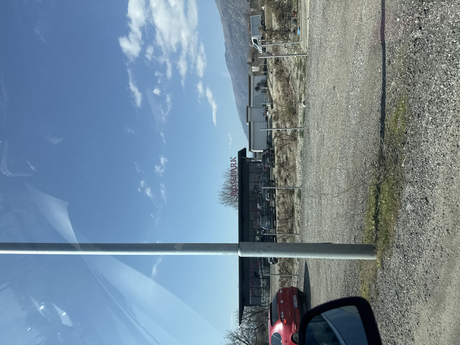 The image presents an outdoor scene in Marino Pole, Bulgaria, observed from inside a vehicle under a clear blue sky with scattered white clouds. A tall, light-grey cylindrical pole runs vertically through the left-center of the frame, with reflections visible on the vehicle's glass surface in the upper left. The immediate foreground consists of a gravel lot with sparse patches of green grass and dry shrubbery. In the midground, a low, rudimentary fence made of slender posts marks a boundary. To the left of the pole and fence, a red hatchback (Bulgarian license plate PP 0405 BC) is parked facing away from the viewer. Behind the fence, a dark, single-story commercial building with expansive glass windows is visible, featuring a red "ROSEPARK" sign on its roofline. Several dark-colored vehicles are parked directly in front of this building. To the right of the "ROSEPARK" building, multiple white, modular-style structures are present, with a white utility van parked further to the right. The background is dominated by a range of barren mountains under the open sky. No individuals are visible within the frame. A portion of a car's side mirror is visible in the bottom-left corner.