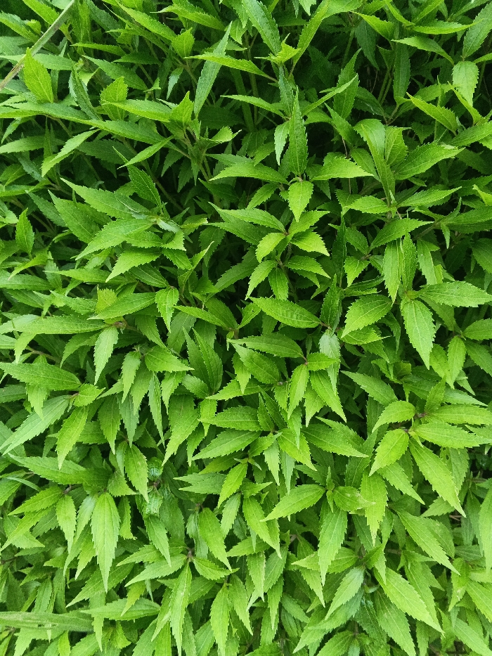 The image displays a densely packed close-up of vibrant green foliage, located in Khna, Cambodia. The entire frame is filled with numerous lanceolate leaves featuring pointed tips and distinctly serrated margins. These leaves exhibit a range of medium to bright green hues, with some displaying subtle glints on their surfaces, suggesting either moisture or light reflection. Thin, green stems are visible amidst the leaves. No human subjects, animals, man-made objects, or actions are present; the scene depicts only natural plant life.