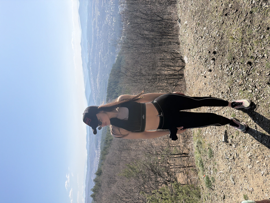 A female subject stands outdoors on a dirt and gravel incline, looking left, with the city of Rudartsi, Bulgaria visible in the distant valley. She wears a black sports bra with an "alo" logo, black high-waisted leggings with white piping and an "alo" waistband, a black baseball cap with a red square logo, and small oval sunglasses. A silver belly button ring is visible. Her long, dark hair extends from under the cap. She wears multi-colored athletic shoes. The foreground consists of sparse dry vegetation and loose earth. The midground features a forested slope with both bare deciduous trees and evergreens. The background reveals a sprawling urban area nestled within a valley, with layers of hills and mountains extending under a clear blue sky.