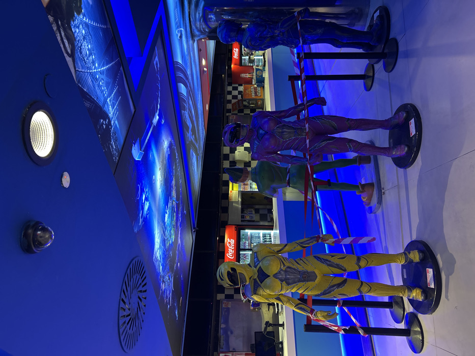 A wide-angle interior view captures an entertainment venue within Ramat HaSharon, Israel, characterized by dominant blue lighting. The scene features four life-sized character statues positioned in the mid-ground, arranged on individual black circular bases. From left to right, these include a yellow-suited Power Ranger, a figure resembling Peter Pan viewed from the rear, a purple-suited Power Ranger, and a dark blue-suited Power Ranger seen from the rear. Red and white striped caution tape, supported by black stanchions, forms a barrier in front of these statues, indicating a restricted or display area. In the background, a concession counter spans the width of the image. Behind the counter, two red Coca-Cola branded refrigerators are visible. A section of the wall behind the counter features a black and white checkerboard pattern. Above the counter, signage includes "FROZEN" and an area displaying blue buckets, likely for snacks. On the far left of the counter, a point-of-sale system, including a monitor, is present. The ceiling is predominantly blue, illuminated by recessed lights, one of which is clearly visible as a circular, bright fixture. A circular ventilation grate is also visible on the blue ceiling. Several large rectangular panels embedded in the ceiling display luminous blue and black abstract patterns, possibly depicting space or cityscapes. A dome-shaped security camera is mounted on the blue ceiling near the upper left quadrant of the image. The floor is light-colored, reflecting the ambient blue light. No individuals are actively present or engaged in interaction within the frame.