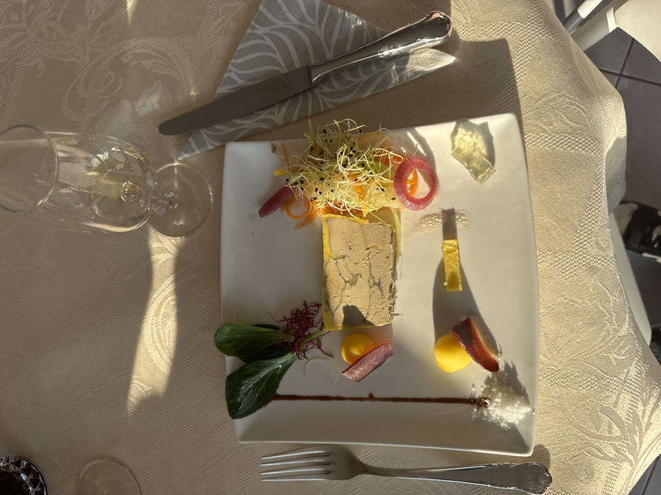 This image presents a high-angle, close-up view of a meticulously plated dish on a dining table, observed in a location within Souffelweyersheim, France. The central subject is a white rectangular ceramic plate holding a portion of what appears to be a terrine or pâté, consistent with foie gras, distinguished by its light brown, textured interior and a surrounding pale yellow layer. The plate features various garnishments arranged around the central item: * On the far left, a vertical drizzle of dark brown sauce concludes in a small pile of white crystalline flakes. * Two small, spherical yellow elements are present, flanking two thin, curved slices of reddish meat. * Above the terrine, a small cluster of dark green leaves (likely corn salad or mâche) is visible, accompanied by fine red sprouts. * To the right of the terrine, a vibrant mound consists of various sprouts (some with visible black seeds), julienned orange carrots, and a single ring of red onion. * Further to the right, a small, rectangular strip of pale yellow gel or custard and an irregular piece of clear, translucent gel are situated. To the left of the plate, a silver four-tine fork with an ornate handle rests on the tablecloth. To the right, a silver knife with a similar ornate handle is placed atop a folded, light-grey napkin displaying a subtle, repeating leaf or floral pattern. Above the knife, a clear stemmed wine glass, containing a small amount of pale liquid consistent with white wine, is visible. A portion of another clear glass is present in the upper-left corner of the frame. The table is covered by a light-colored (beige or cream) tablecloth with an embossed or woven pattern. Strong, directional natural sunlight illuminates the scene from the upper right, casting distinct shadows from the glassware and the food onto the tablecloth. Portions of a light-colored tiled floor and a white chair leg are visible in the lower right quadrant of the image.