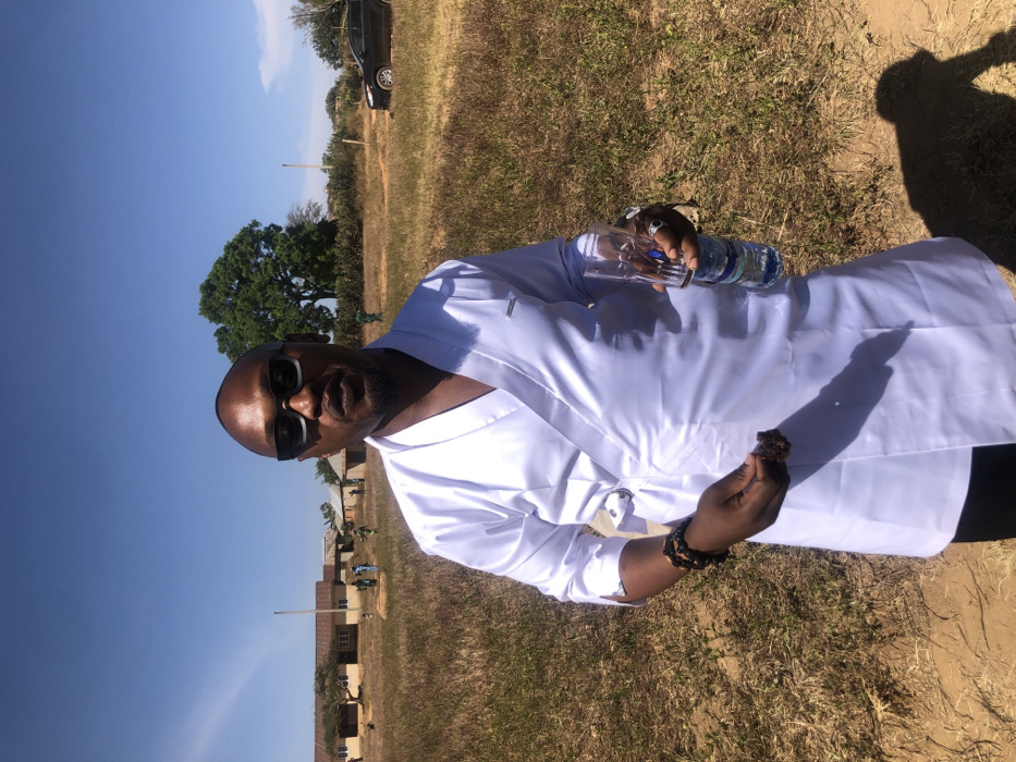 An adult male stands outdoors in what appears to be a dry, grassy field in Kerang, Nigeria, under a clear blue sky. He faces the camera directly, wearing dark sunglasses and a white, long-sleeved, wrap-style tunic over dark trousers. His mouth is slightly open. On his left wrist, he wears multiple dark bracelets, and he holds a small, dark, irregularly shaped object in his left hand. In his right hand, he holds a clear plastic water bottle and a clear glass with a dark pattern near its base. In the background, to the left, are several low-rise buildings with light-colored walls and dark roofs, consistent with institutional structures like a school. Several small figures, possibly children, are visible near these buildings. A flagpole is also present near the buildings. Further back on the right, a large green tree stands, and a dark-colored vehicle, possibly an SUV, is parked in the distance. The ground is covered in dry, sparse grass and dirt. Shadows are visible on the ground, indicating direct sunlight.