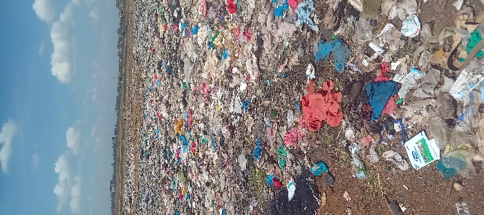 The image displays a vast open-air landfill, identified as the Dandora Dumpsite in Nairobi, Kenya