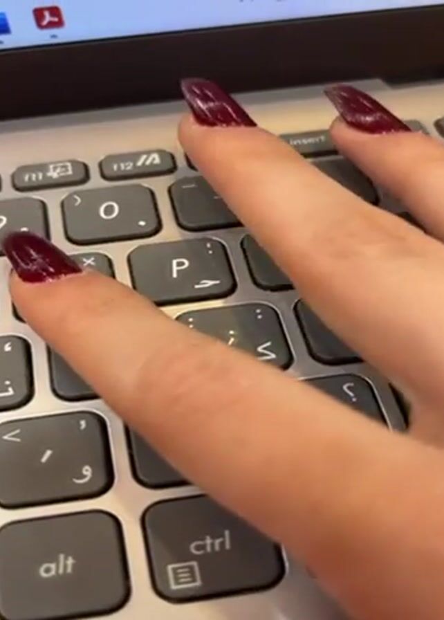A hand with long, dark, maroon fingernails hovers over a laptop keyboard with Arabic characters in addition to standard English letters