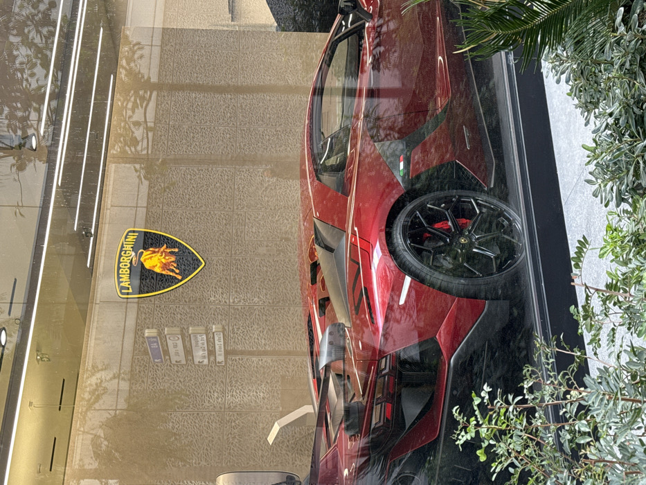 - "A red Lamborghini sports car is prominently displayed within a showroom, viewed through a large, reflective glass window" by FM-ZxqxJ2, licensed under CC BY 4.0