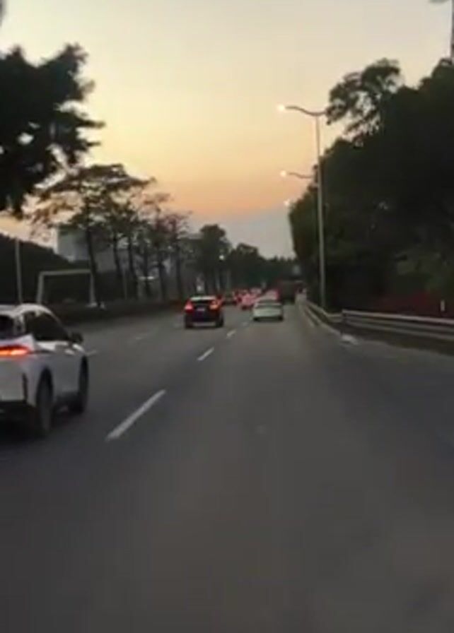 A car drives down a highway at dusk. Other cars are visible in the lane ahead. Trees line the side of the road, and streetlights illuminate the way. An electrical tower stands in the distance. Music plays.