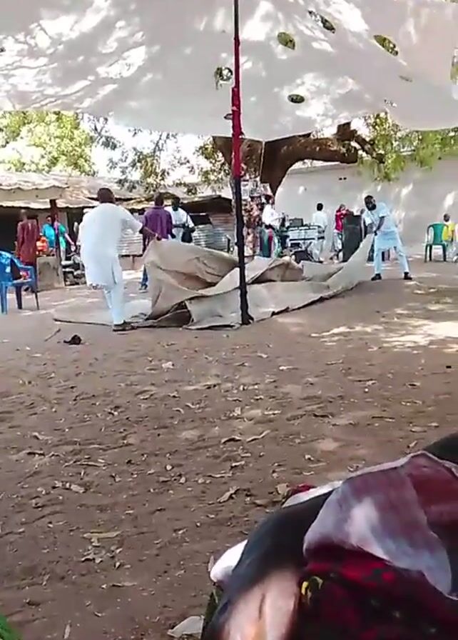 group of people in an outdoor space, possibly preparing for an event. Several individuals in white clothing are manipulating a large sheet of material on the ground. There is a makeshift white canopy overhead, supported by a central pole. In the background, there are buildings and trees. The ground is dirt and littered with leaves. The camera appears to be held by someone seated, with glimpses of their clothing visible in the foreground. The overall scene suggests preparations for an outdoor gathering or celebration.