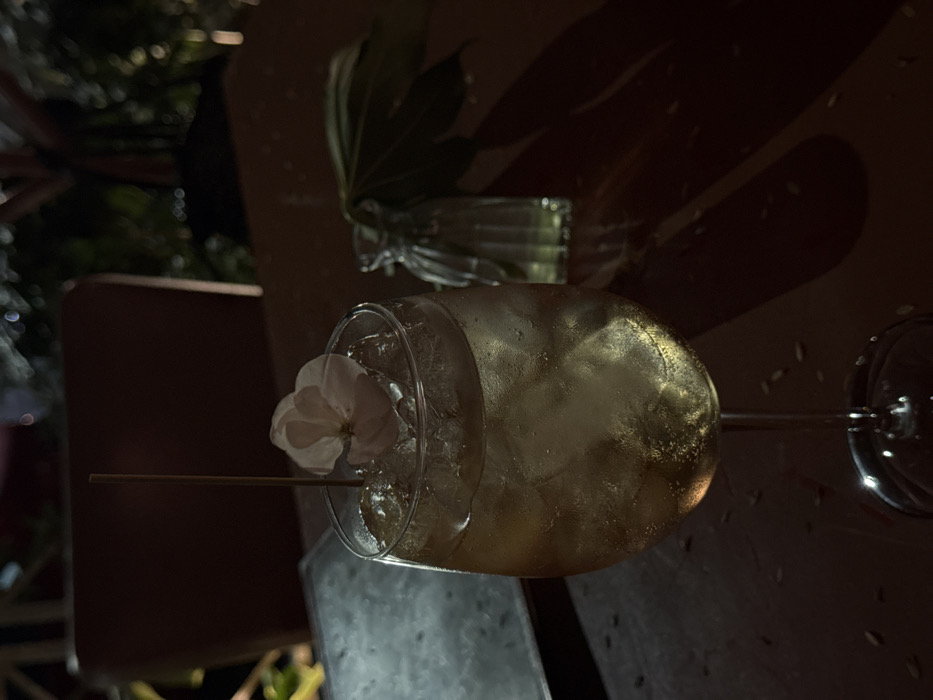 A close-up showcases a cocktail glass filled with ice and a golden liquid, adorned with a white flower on a toothpick. The drink sits on a dark surface, likely a bar. Nearby, a small vase with green leaves adds to the ambiance. Shadows cast by the leaves create patterns on the surface, contributing to the dimly lit setting. In the background, blurred greenery and a chair are visible.
