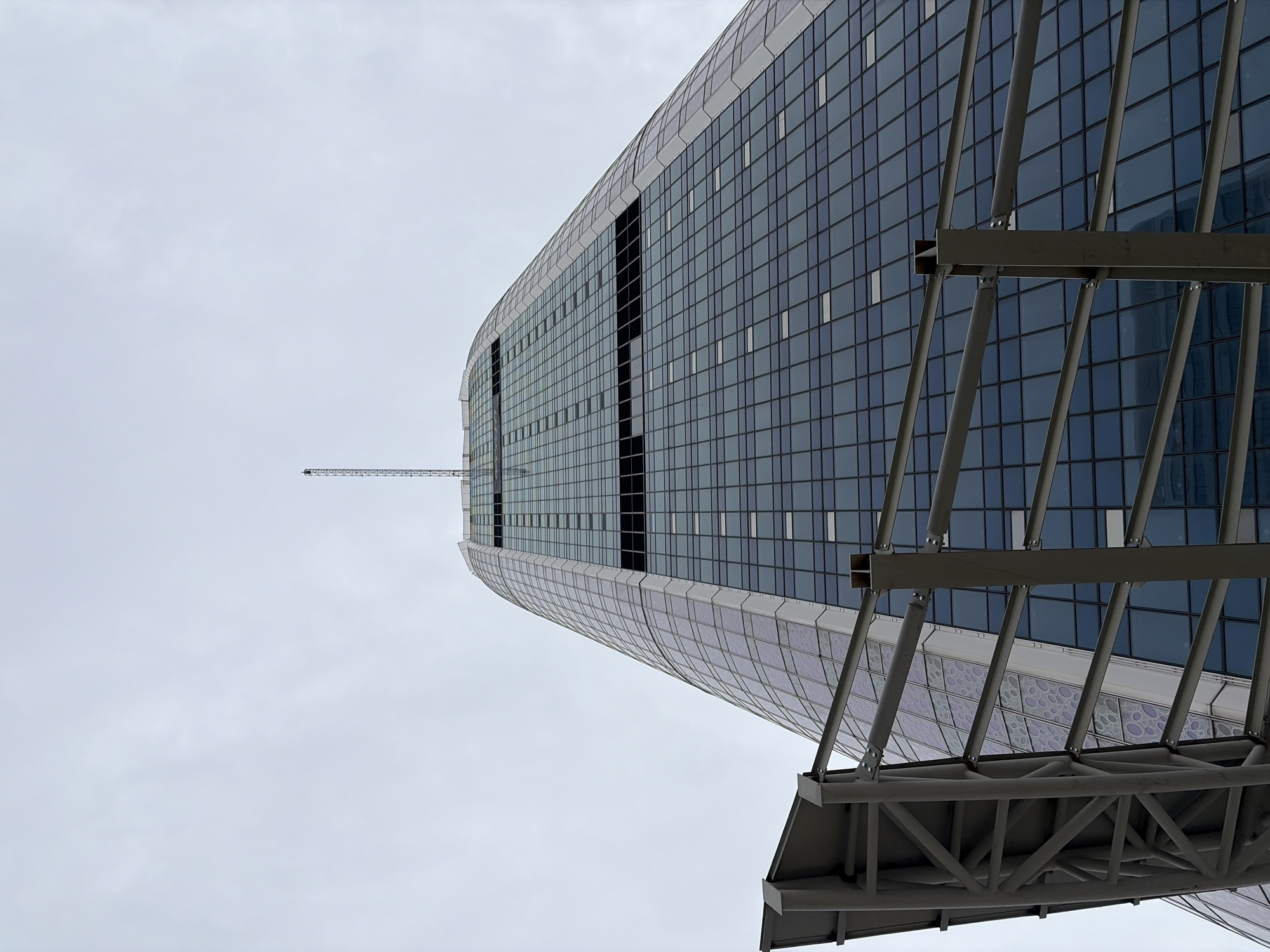 The image depicts a modern building in Sofia, Bulgaria. The architectural style is characterized by a predominantly glass façade arranged in a grid pattern. The building has a curved shape at its edge. A crane is visible in the background, suggesting possible ongoing construction or maintenance. The building is also supported by a metal structure that can be seen in the foreground of the image. The sky is overcast.
