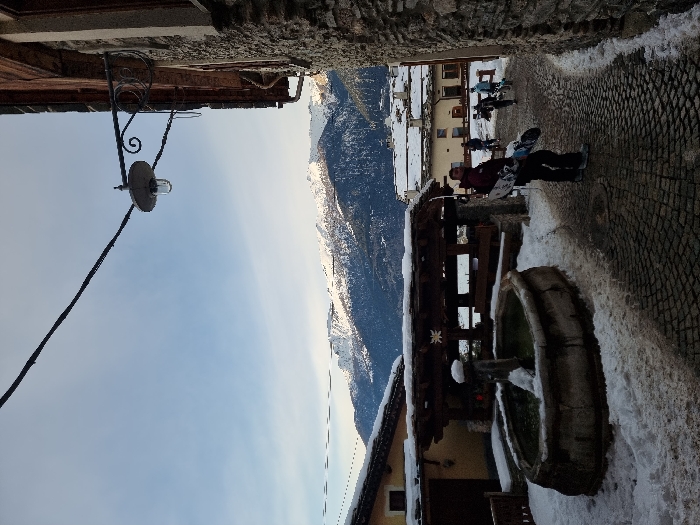 A narrow street in a mountainous village. Buildings line either side, constructed from stone and wood. A fountain stands in the foreground, coated in snow. In the background, snow-capped mountains rise, with buildings nestled at their base. A person carrying a snowboard walks along the cobblestone path. Overhead, a street lamp hangs against a clear, pale blue sky.