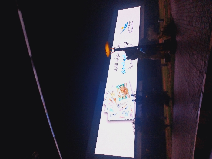 A brightly lit vertical billboard showcases "Syrian Post." Below the logo, Arabic text is displayed, followed by a colorful collection of stamps. A street lamp casts a glow near the billboard's top. A figure appears to be standing beside the billboard. The scene is set at night, with darkness dominating the background. A paved walkway borders the scene.