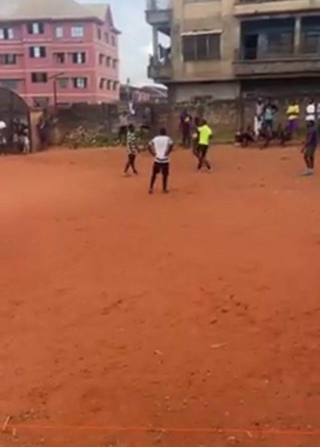 soccer game taking place on a dirt field. Several people are standing and walking around the field, and some appear to be playing soccer. The players are wearing casual clothing, including striped, neon, and dark shirts. There is a gate in the background behind some people on the left. Other people can be seen behind the gate. Buildings are visible in the background as well. The sky is cloudy and overcast.