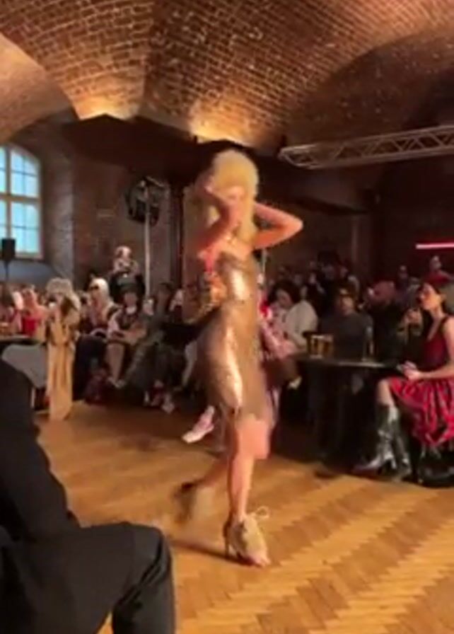 The video captures a dynamic moment at what appears to be a fashion show or performance within a venue with distinctive brick arch architecture. A performer, presumably a drag queen, with voluminous blonde hair and wearing a sparkly gold dress and heeled boots is energetically dancing or posing for the audience. They have a small, decorative purse slung over their shoulder. The audience is seated around the perimeter of the room. A person with bright pink hair and a pink-patterned suit stands out among the crowd. The room is illuminated by stage lighting, creating highlights and shadows on the walls and people. A wooden floor spans the performance space. The environment suggests an upscale or unique event taking place in a historic building.