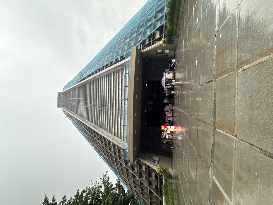 A tall building with a latticework exterior rises against a cloudy sky. One side of the building features a grid of rectangular windows. People are gathered near the entrance, some holding umbrellas. The ground appears wet, possibly from rain, and is covered with large square tiles. Trees are visible at the base of the building.