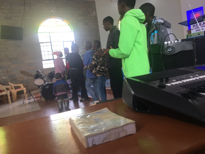 The image depicts an interior scene, likely a church or community hall, located in Ndeiya, Kenya